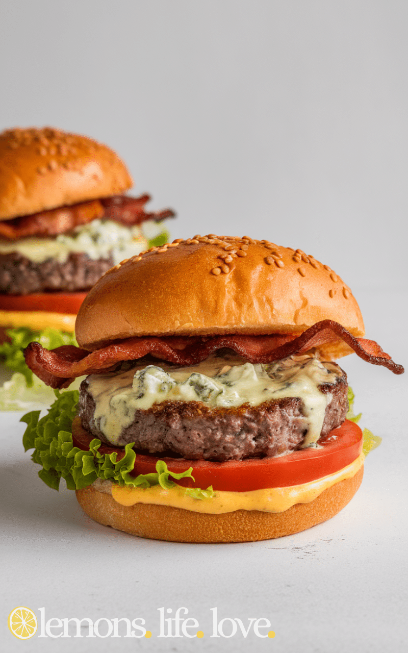 The Blue Cheese Burger is one of the best crowd-pleasing burger recipes because it adds a bold, tangy flavor with creamy blue cheese and it melts perfectly over a juicy beef patty and it combines beautifully with fresh lettuce and ripe tomato and it is easy to make at home and it brings gourmet taste to your table and it is perfect for burger lovers who want something unique and exciting and it is simple to assemble and it is one of the yummiest burgers for gatherings and parties and it is a crowd-pleasing burger recipe everyone will enjoy.