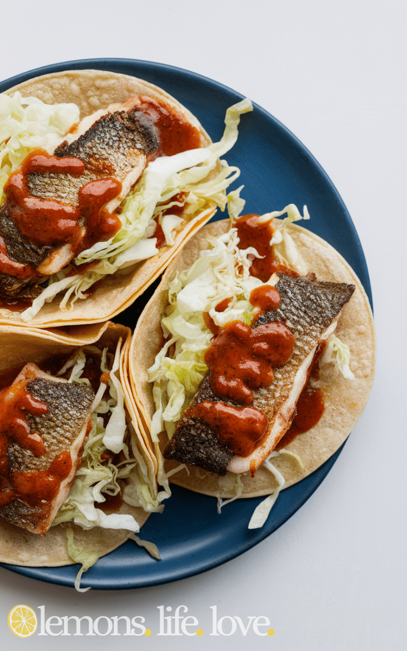 - Assemble tacos with fish, cabbage, avocado, and sauce.