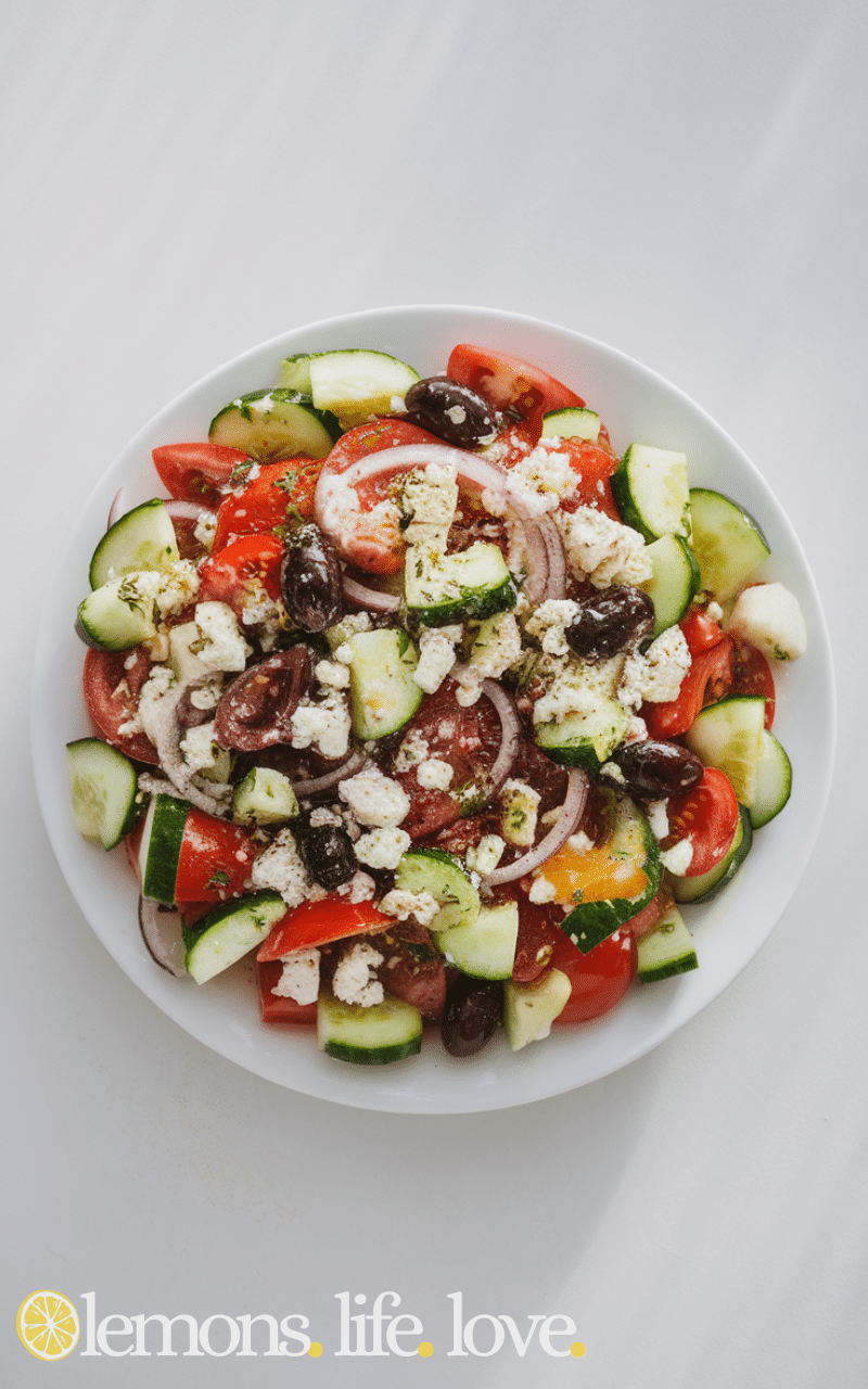 The Classic Greek Summer Salad is a delicious fresh summer salad made with crisp cucumbers and ripe tomatoes and juicy red onions and olives and tangy feta cheese and all ingredients come together with olive oil and lemon juice and it’s super easy and healthy and makes your summer meals colorful and refreshing and every bite gives a crunchy and flavorful experience and you can enjoy it on its own or pair it with grilled dishes and this fresh summer salad is always a favorite for family and friends.
