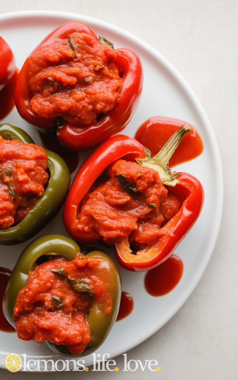 Stuffed peppers with tomato sauce are easy and delicious because the tomato sauce seeps into the filling making it juicy and full of flavor and it’s perfect for a light lunch or dinner and you can stuff the peppers with rice, vegetables, or ground meat and the tomato sauce enhances the taste and keeps everything moist and tender and this tomato sauce stuffed peppers recipe is perfect for anyone looking for a healthy, flavorful, and easy-to-make meal that everyone will enjoy because it’s colorful, hearty, and full of tomato sauce goodness.