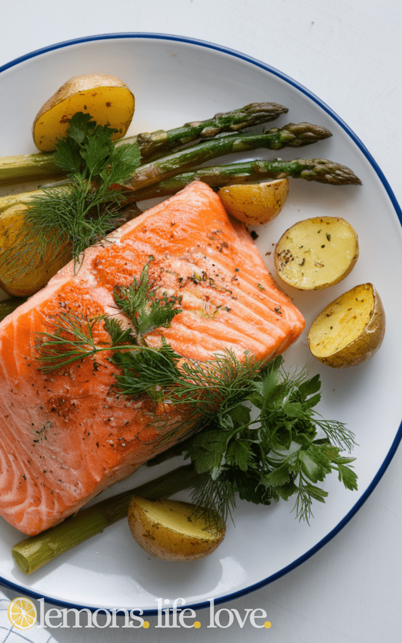 This baked salmon with herbs and vegetables recipe is healthy colorful and also very easy and it combines fresh herbs like rosemary thyme and parsley with seasonal vegetables and it is one of the most balanced baked salmon recipes and you can serve it with quinoa or rice and it keeps the salmon juicy and the vegetables tender and flavorful and it is perfect for a wholesome dinner and everyone will enjoy the aroma and taste and it makes your meal look beautiful and inviting and the preparation is simple and quick.