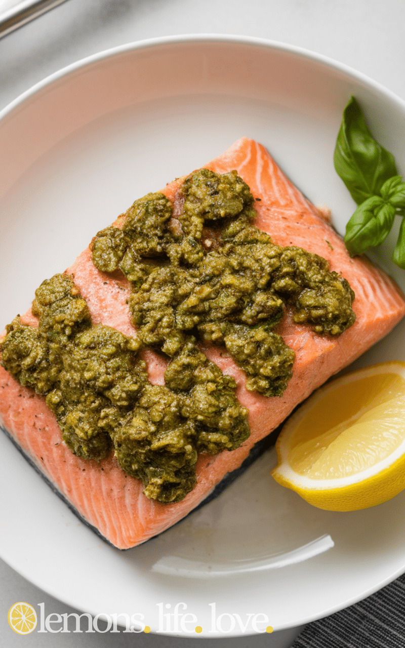 This pesto baked salmon recipe is fresh flavorful and also very easy and it brings the aromatic taste of basil garlic and parmesan together with salmon and it is one of the most vibrant baked salmon recipes and you can serve it with pasta or roasted vegetables and it keeps the salmon moist and full of flavor and it is perfect for a quick weeknight dinner and everyone will love the rich green color and herby taste and it makes your dinner feel fancy without effort and the preparation is simple and straightforward.