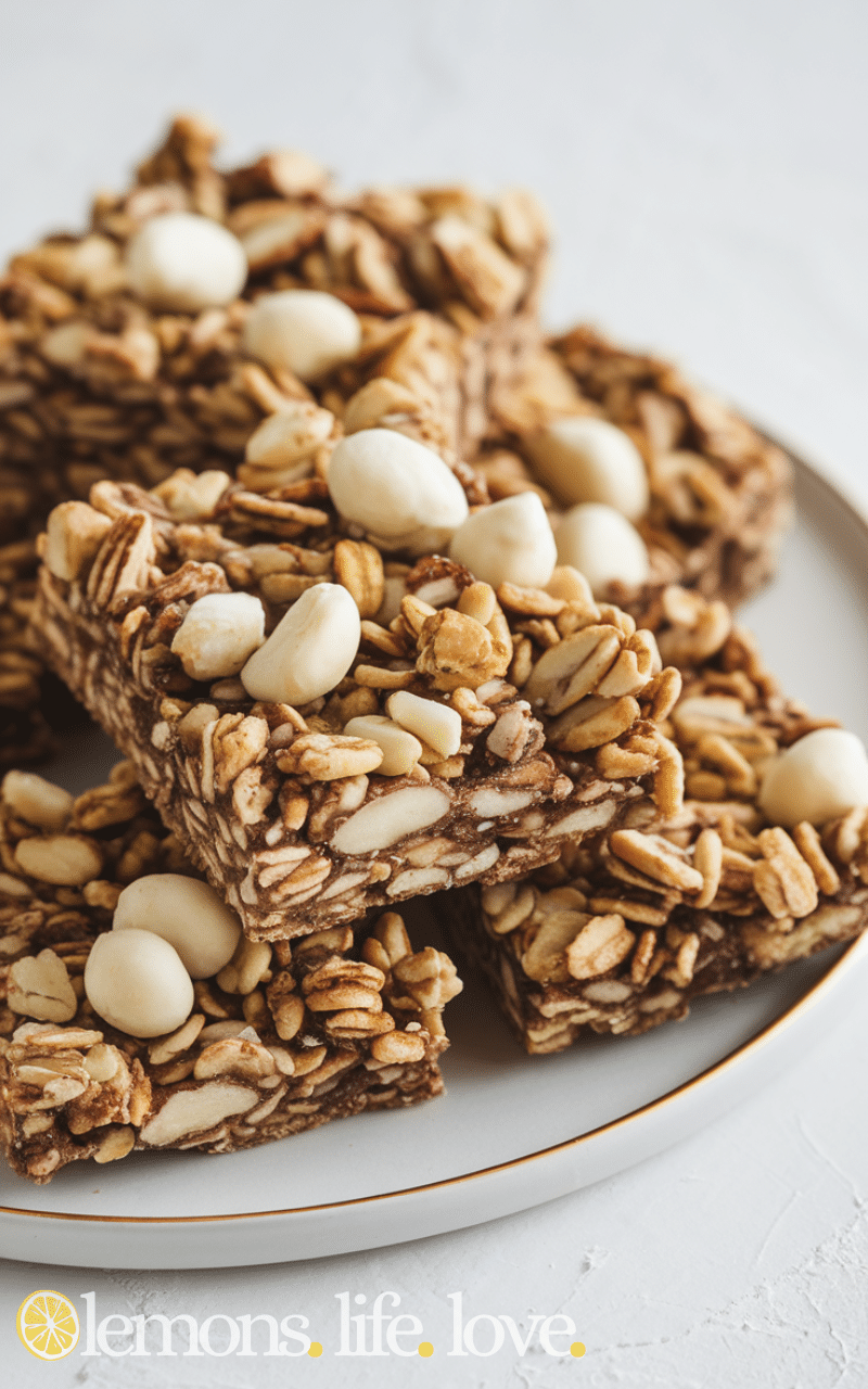 White Chocolate Macadamia Chewy Granola Bars are rich and sweet and very easy to make and they combine creamy white chocolate with crunchy macadamia nuts so every bite of these chewy granola bars is indulgent and satisfying and perfect for dessert snacks or special occasions because they stay chewy and soft making them one of the yummiest chewy granola bar recipes for anyone who loves a treat with a little crunch and creaminess.