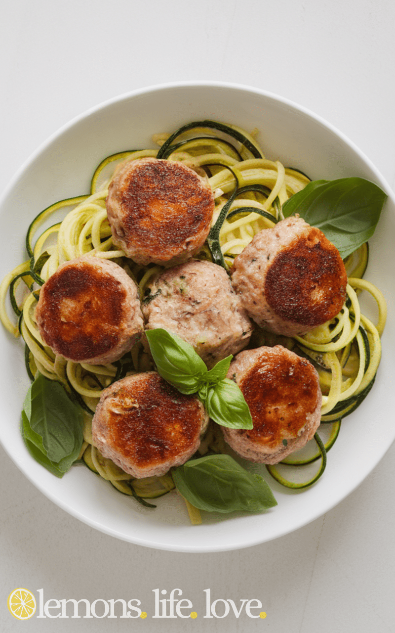 Turkey Meatballs with Zucchini Noodles is a comforting high protein low carb recipe. Juicy turkey meatballs pair with tender zucchini noodles, perfect for dinner and meal prep.