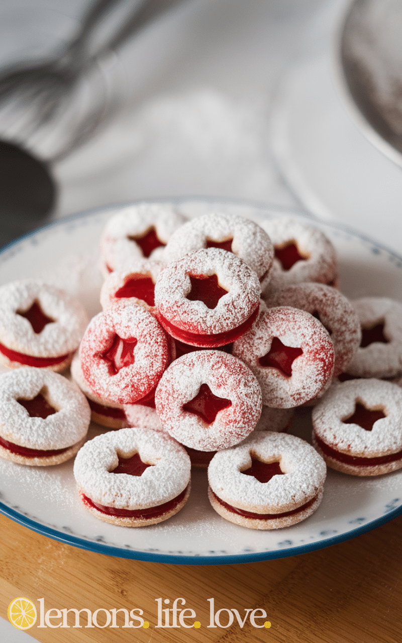 Linzer cookies are delicate and buttery and filled with sweet raspberry jam and they are one of the best holiday cookies because they look elegant and festive and they are fun to make with cookie cutters and they bring color and flavor to your holiday cookie platter and everyone enjoys them with tea or coffee.