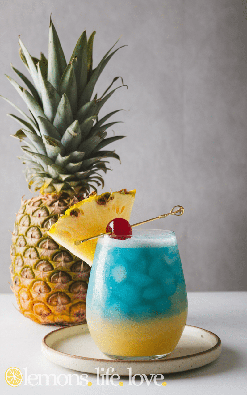 The Pineapple Blue Lagoon is an easy pineapple mocktail that mixes pineapple juice with blue curaçao syrup and sparkling water. It creates a visually stunning tropical drink that is fun and colorful. Ice cubes keep it perfectly chilled, and pineapple slices make it attractive for serving.
