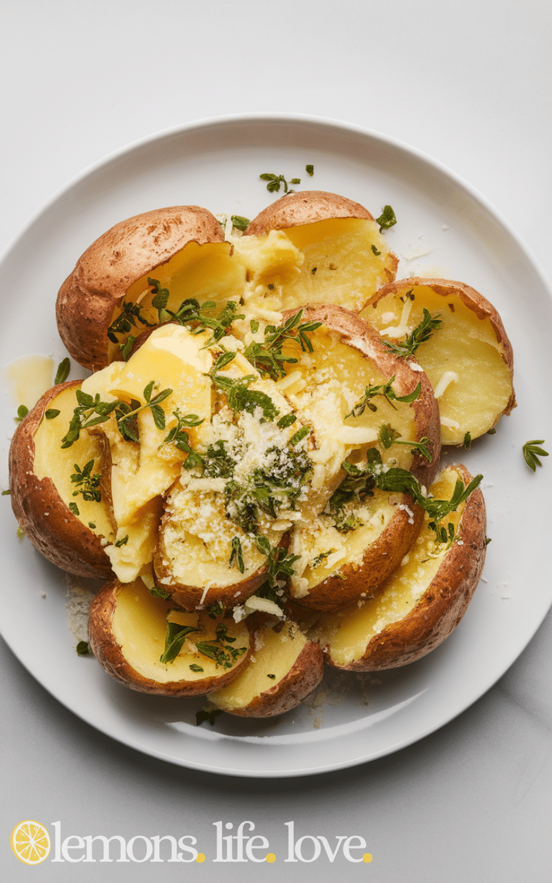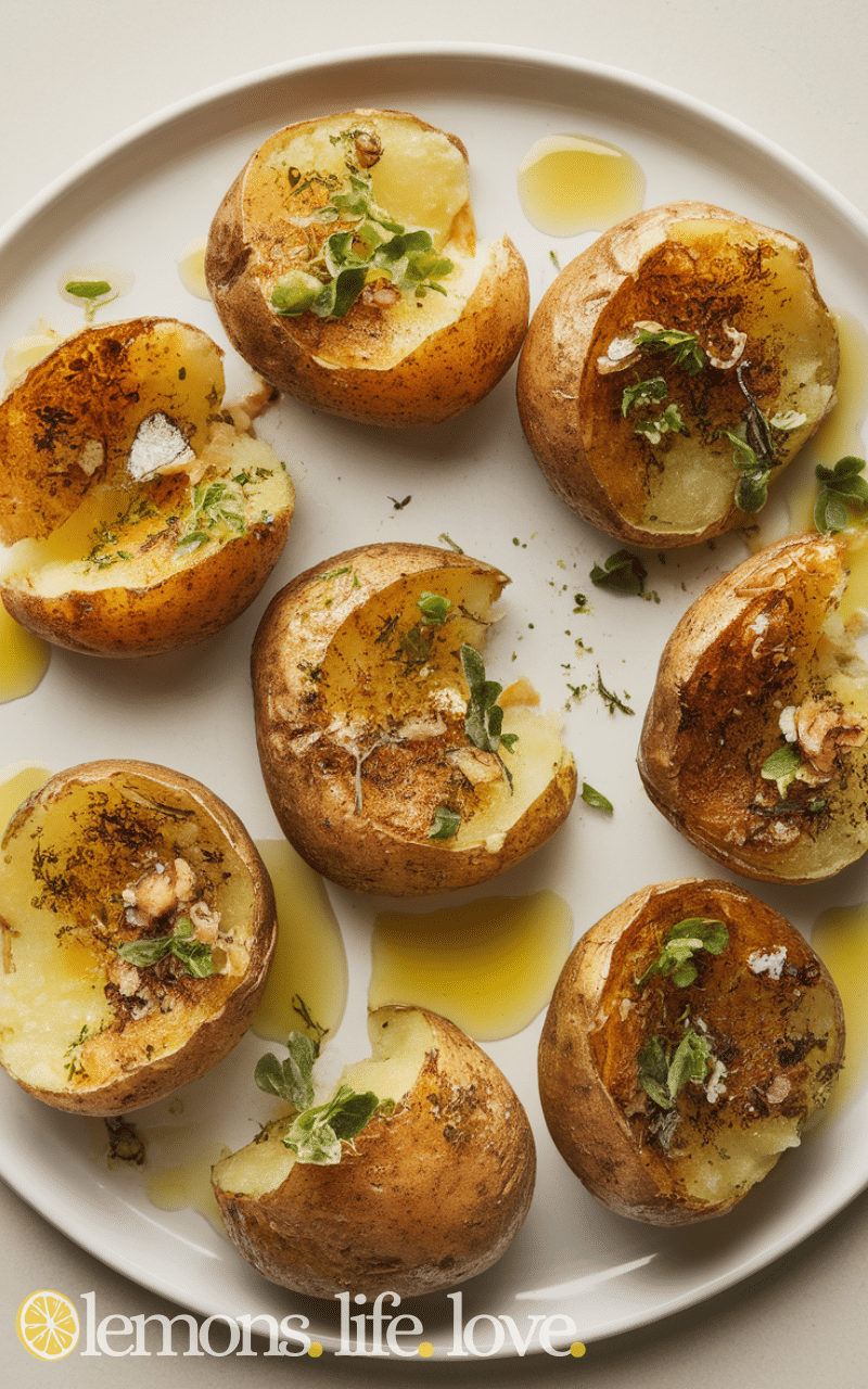 - Smash potatoes, drizzle olive oil, garlic, lemon juice, salt, and pepper.
