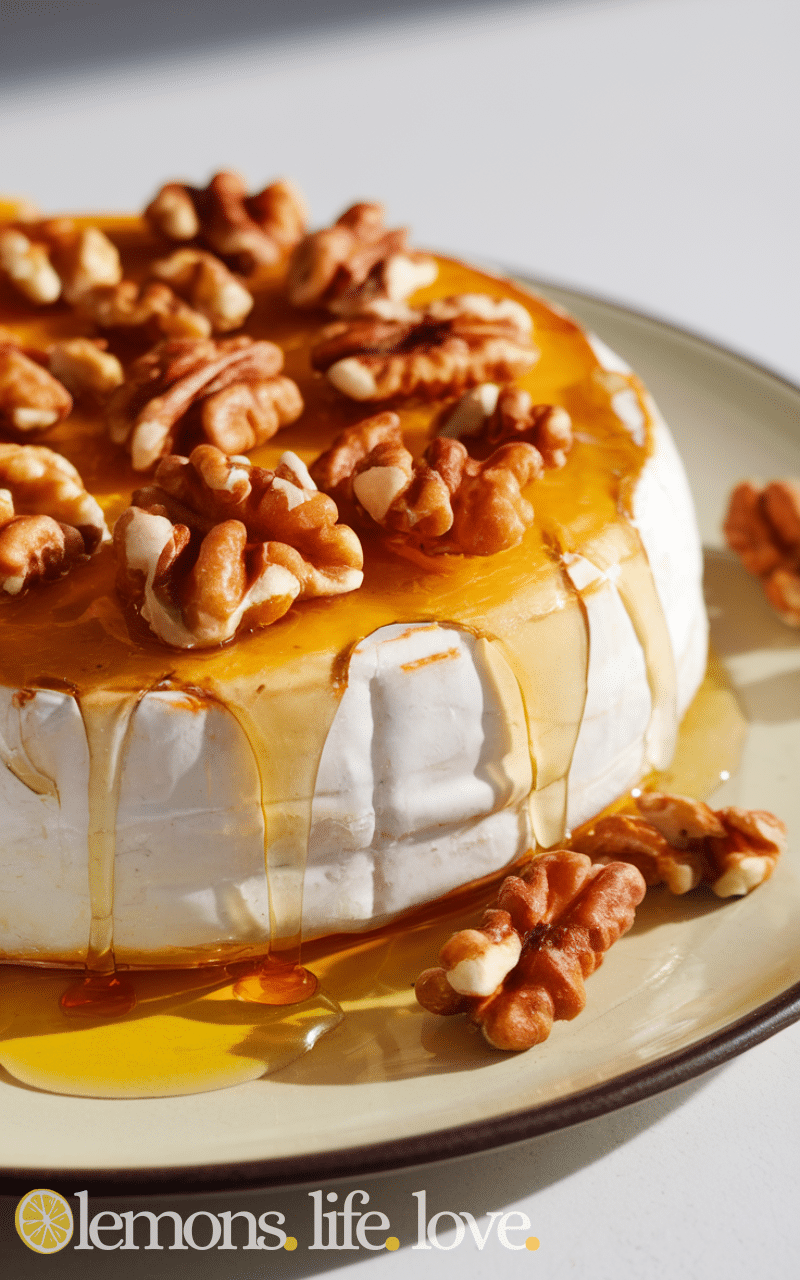 - Drizzle the honey over the brie and sprinkle chopped walnuts on top.