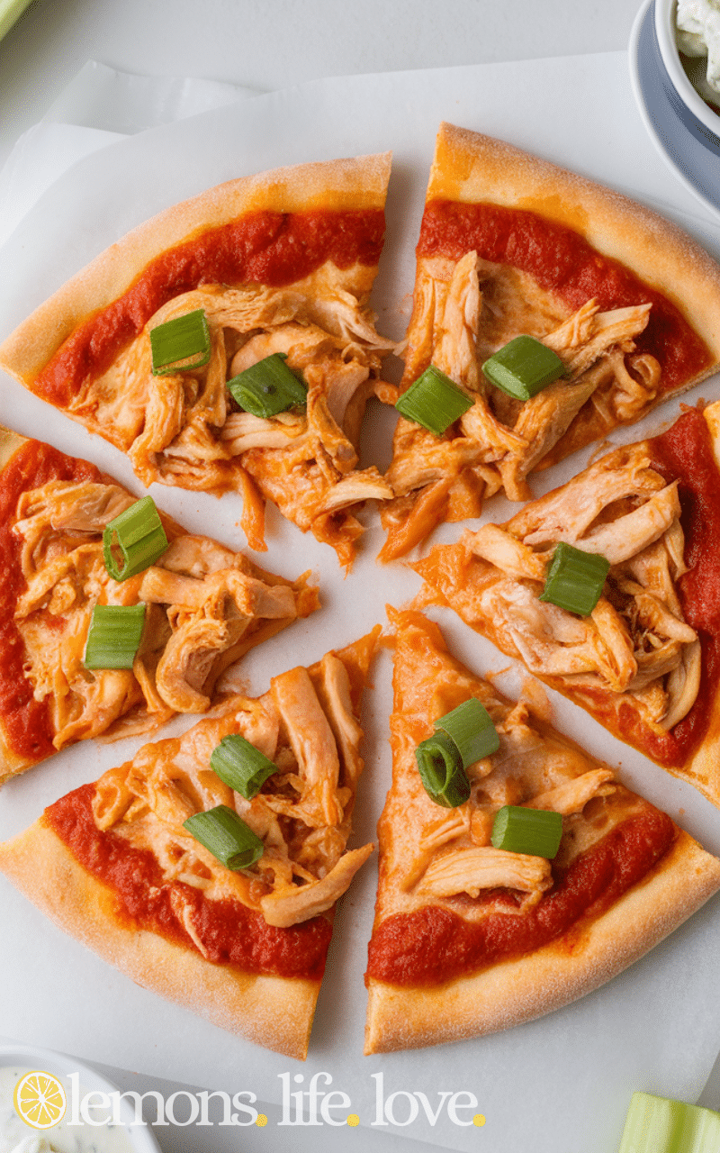 Buffalo chicken pizza is a spicy and tangy homemade pizza recipe that combines shredded chicken tossed in buffalo sauce with mozzarella and cheddar cheese on a crispy pizza crust and this homemade pizza recipe is perfect for spicy food lovers and easy to make at home and when baked the homemade pizza recipe turns golden and cheesy and the spicy buffalo chicken flavor blends perfectly with the melted cheese and it is one of the best homemade pizza recipes for game day or dinner and everyone will love this tangy and zesty homemade pizza.