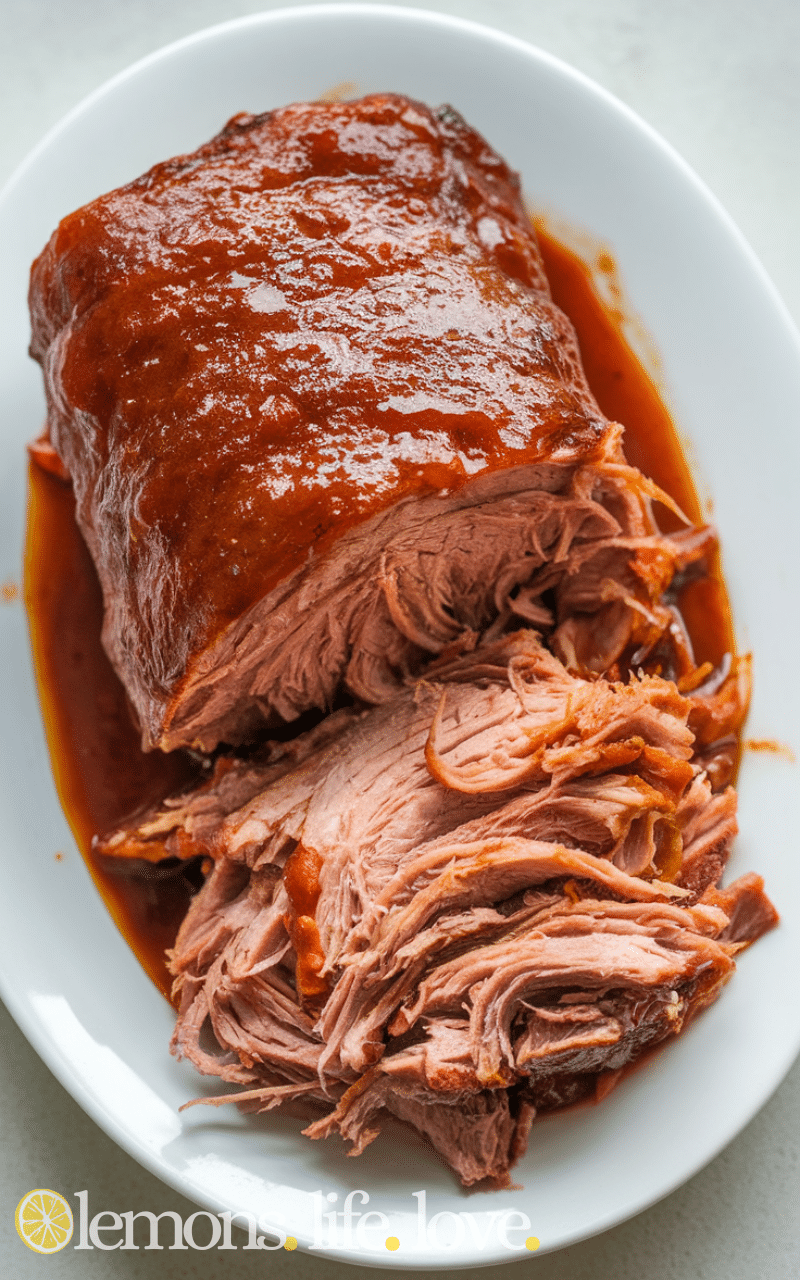 - Pour BBQ sauce over pork.
