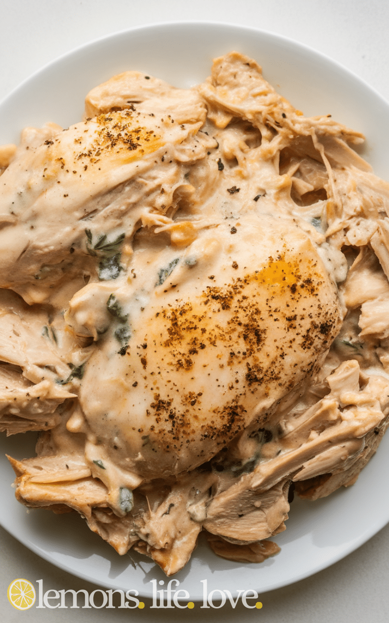 - Shred chicken and stir into creamy sauce.