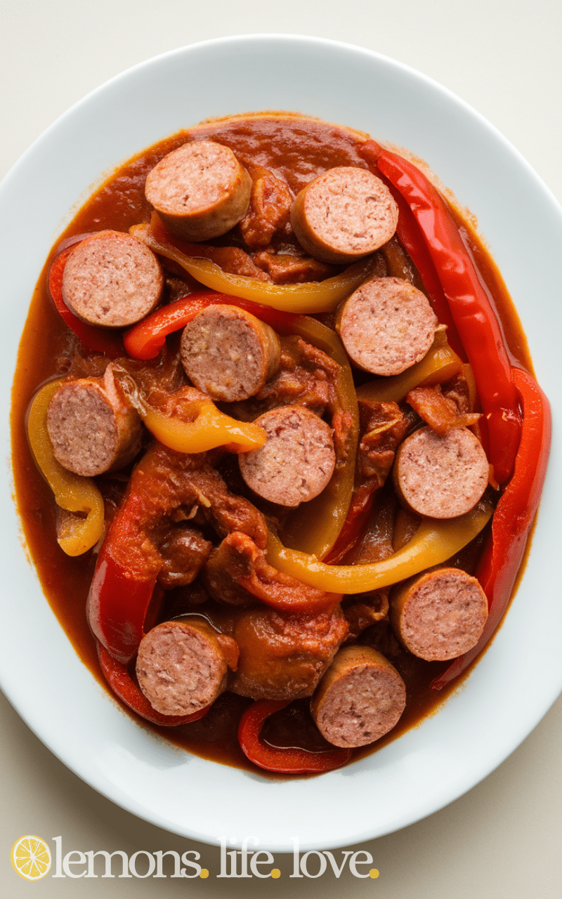 - Place sausage, peppers, onion, and sauce in slow cooker.