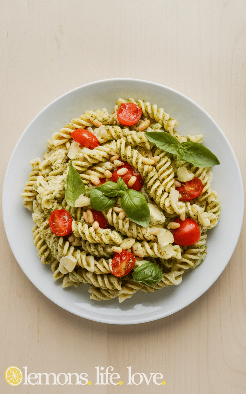 With the fresh flavor of basil pesto, this delicious pasta salad recipe is vibrant, aromatic, and perfect for any occasion. It’s made with cherry tomatoes, mozzarella, and pasta tossed in green pesto that gives it a beautiful color and irresistible taste.