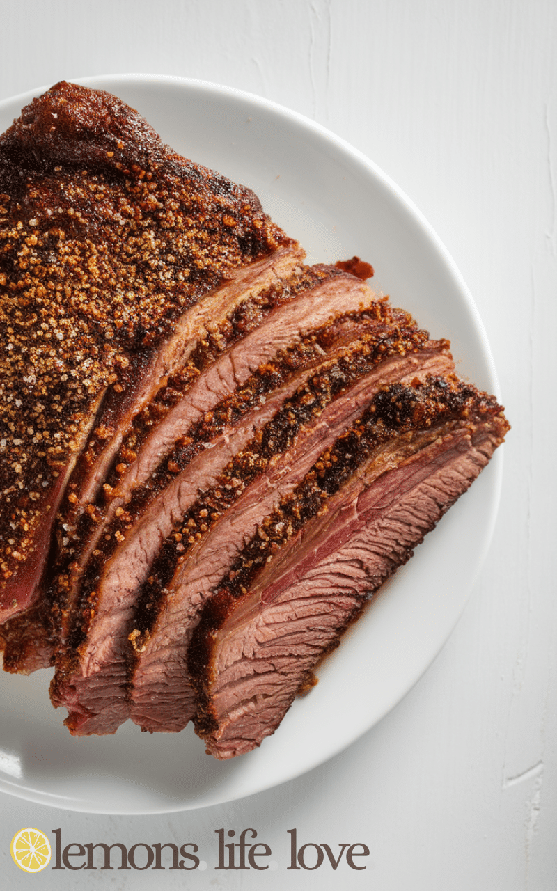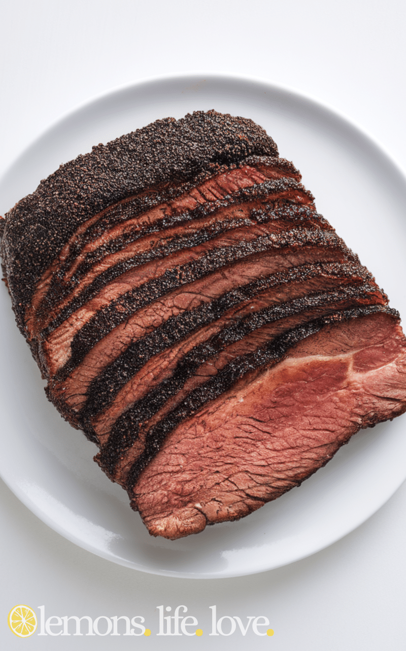 This smoked brisket uses a bold coffee rub, which gives it an earthy crust. The coffee enhances the smoky flavor, creating a robust and delicious dish.