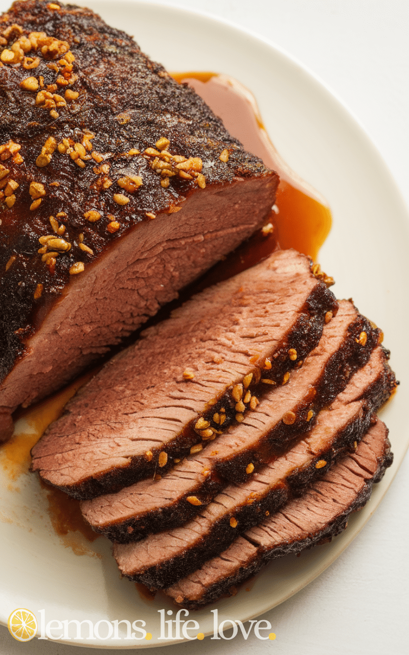 This smoked brisket features hoisin sauce and five‑spice powder, creating a fusion dish with sweet, savory, and aromatic flavors.