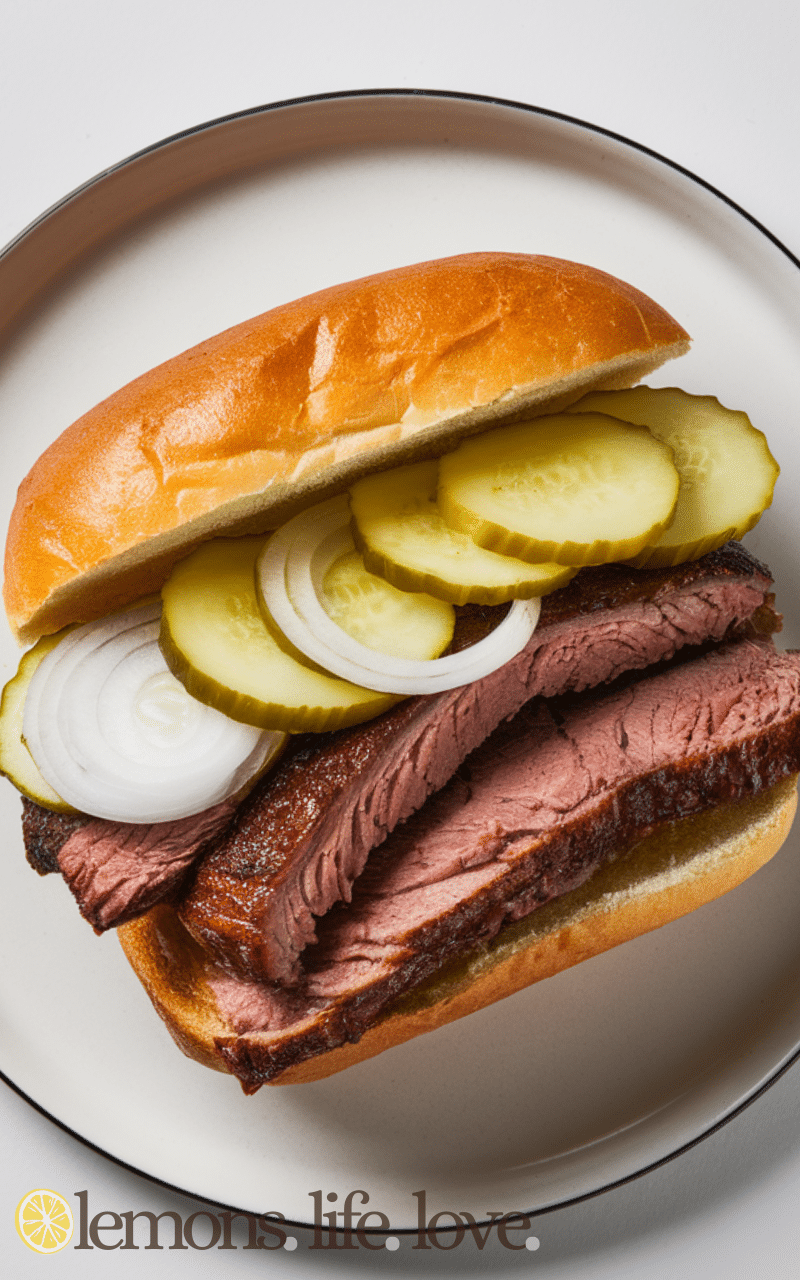 This smoked brisket sandwich transforms smoked brisket into a handheld delight. Pickles and onions add crunch and flavor.
