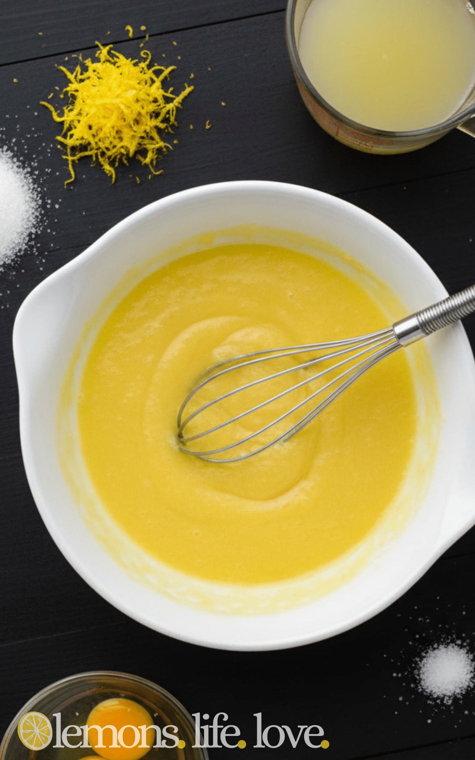 While the crust is baking, grab a small bowl. Mix granulated sugar, eggs, fresh lemon juice, lemon zest, baking powder, and salt together. Whisk until everything is smooth and creamy. The mixture should be bright yellow and smell very lemony.