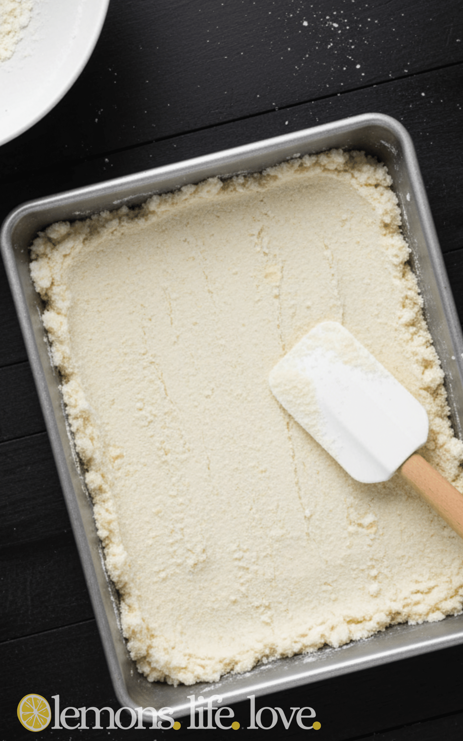 • In a large mixing bowl, mix all-purpose flour and powdered sugar. Add the softened butter and use your fingers or a spatula to mix until it looks like sand. Press this mixture into the bottom of your baking pan. Make it smooth and even so your lemon bars bake evenly.