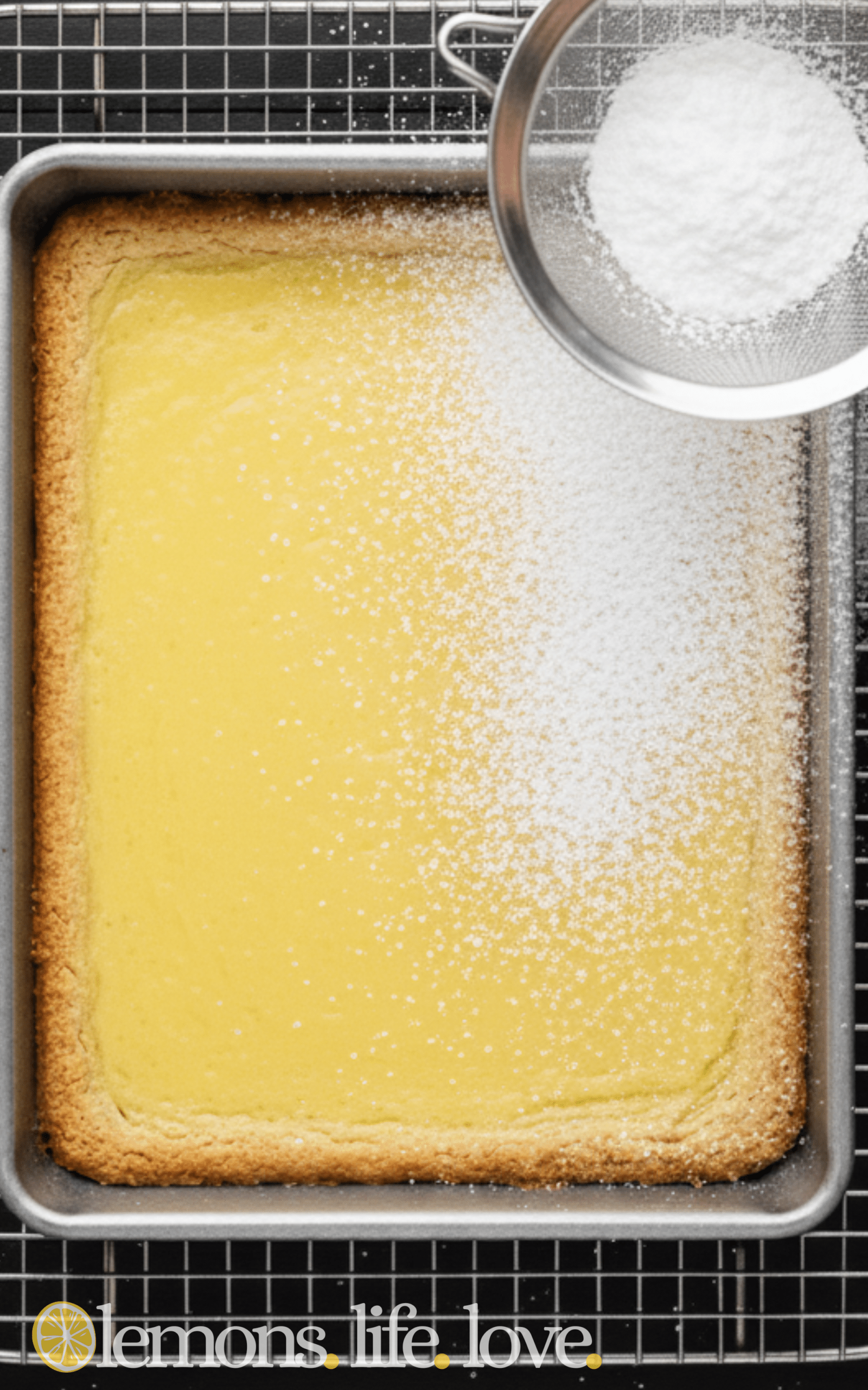 • Once cooled, sprinkle powdered sugar over the top. You can use a sifter for an even layer or just sprinkle with a spoon. This makes your bars look pretty and adds extra sweetness.