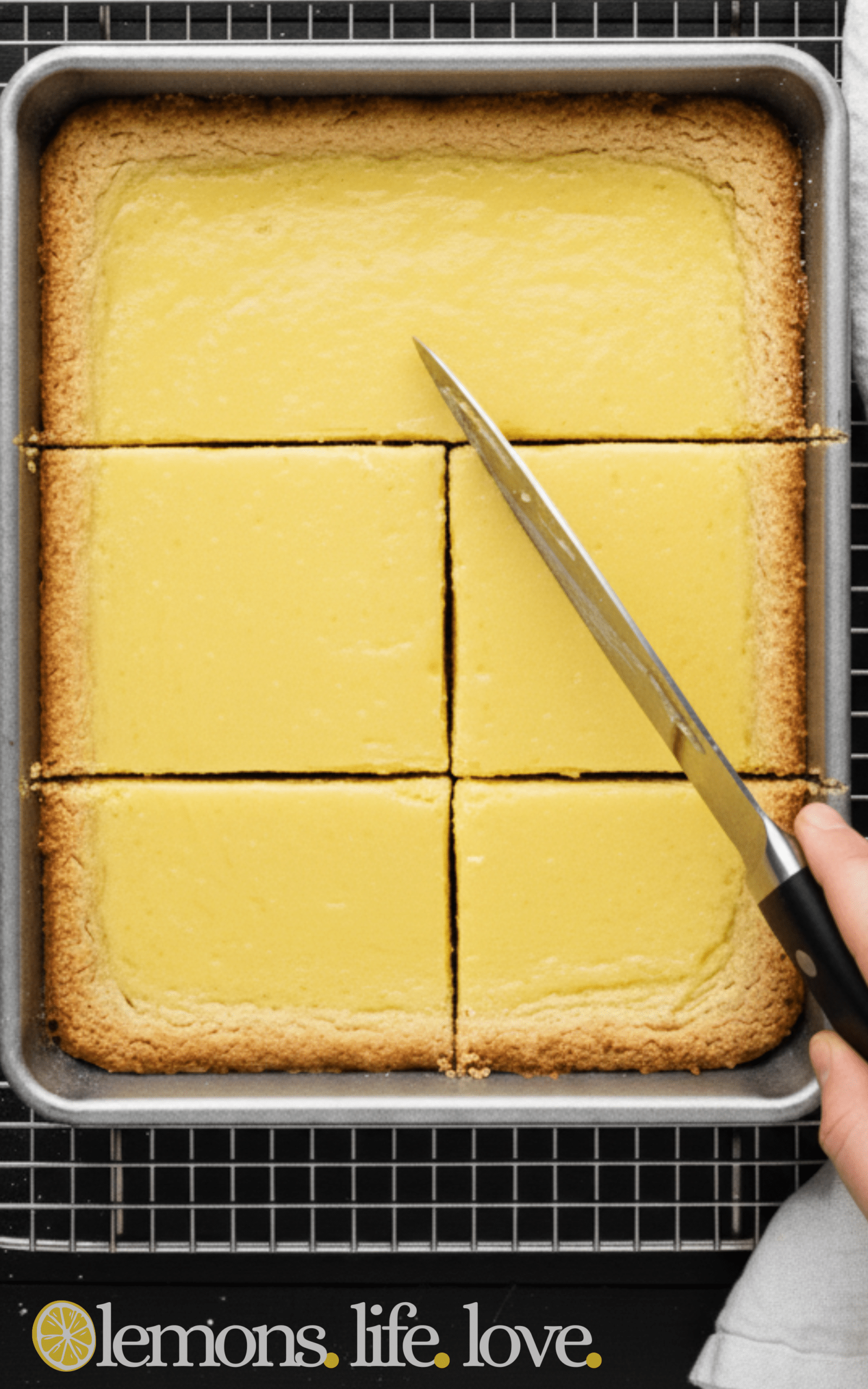 Use a sharp knife to cut the lemon bars into squares. Wipe the knife between cuts for clean edges.
