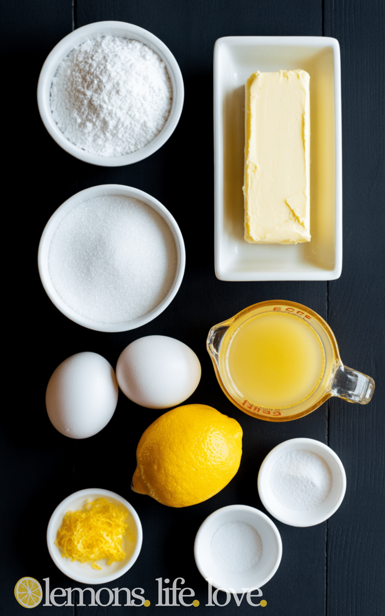 This recipe is made of a buttery crust at the bottom and a sweet, tangy lemon filling on top. The crust is made from flour, butter, and powdered sugar. The filling is made from eggs, granulated sugar, fresh lemon juice, lemon zest, a little baking powder, and a pinch of salt.