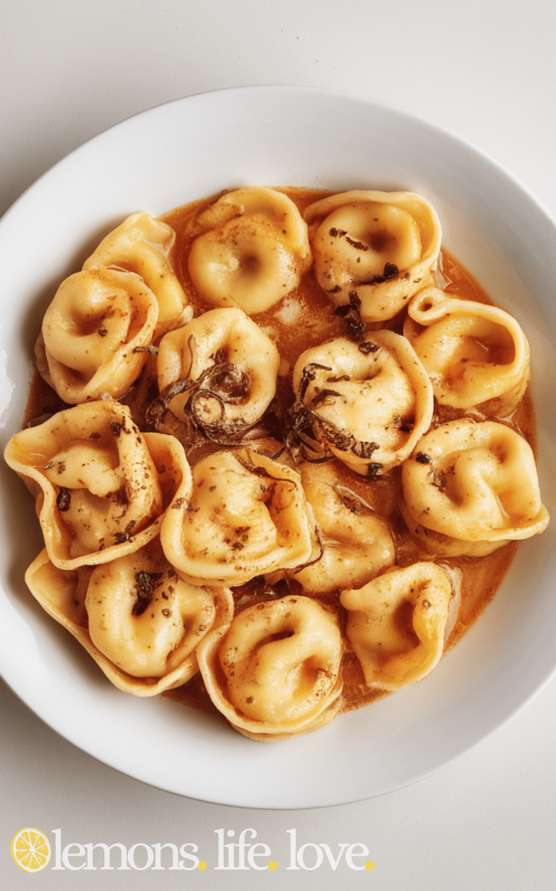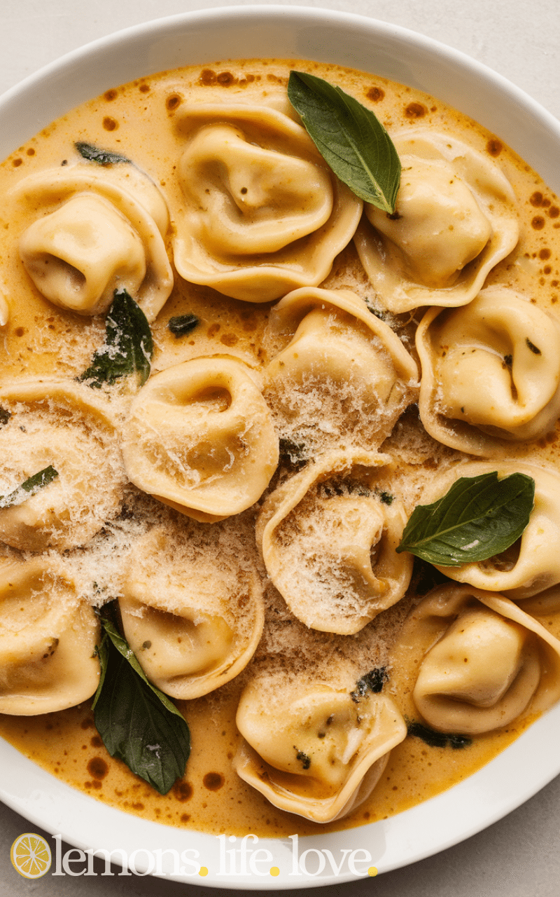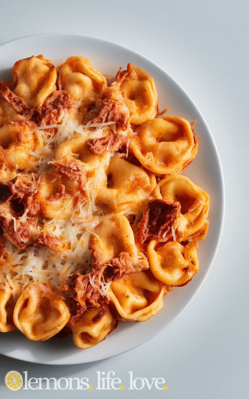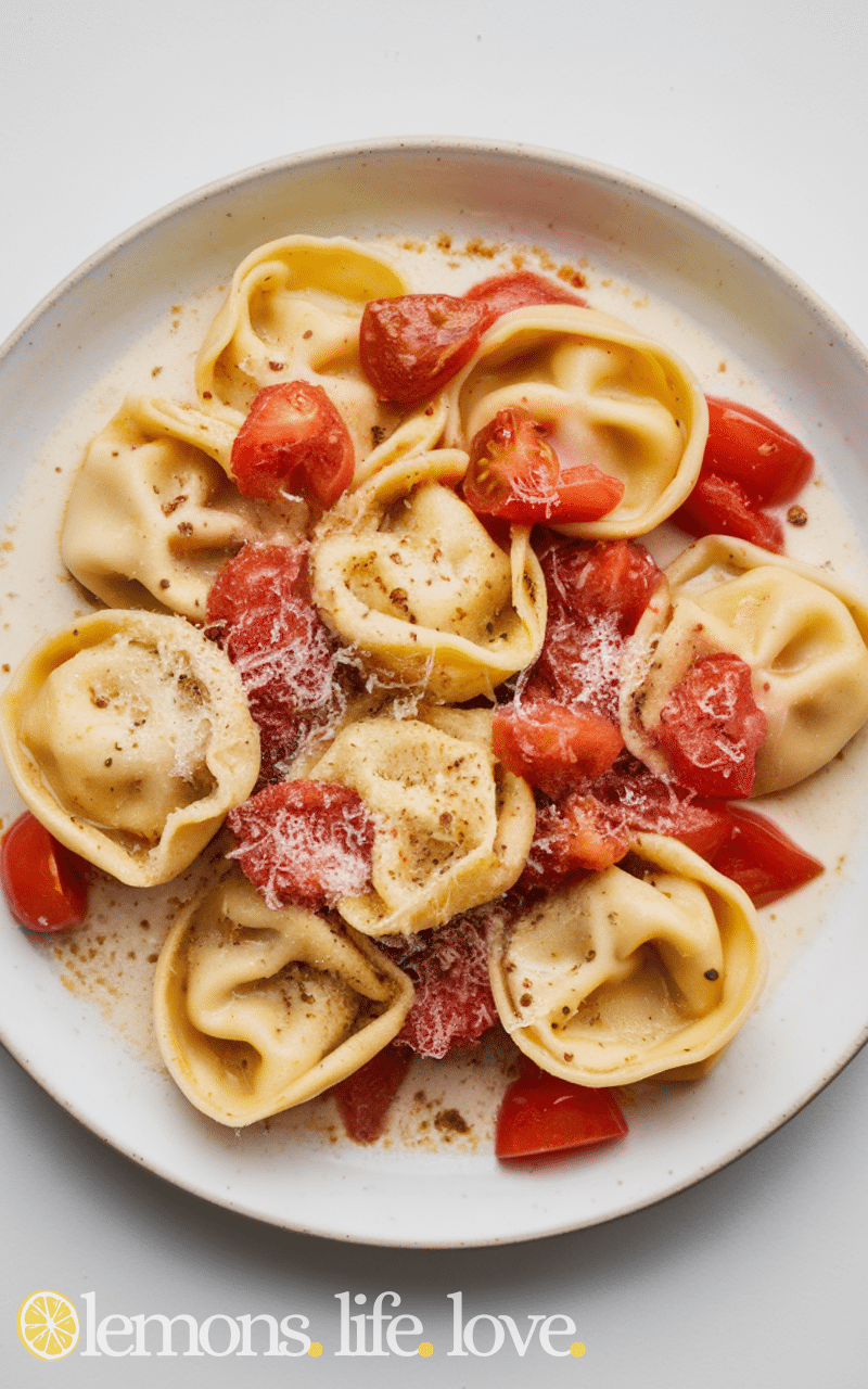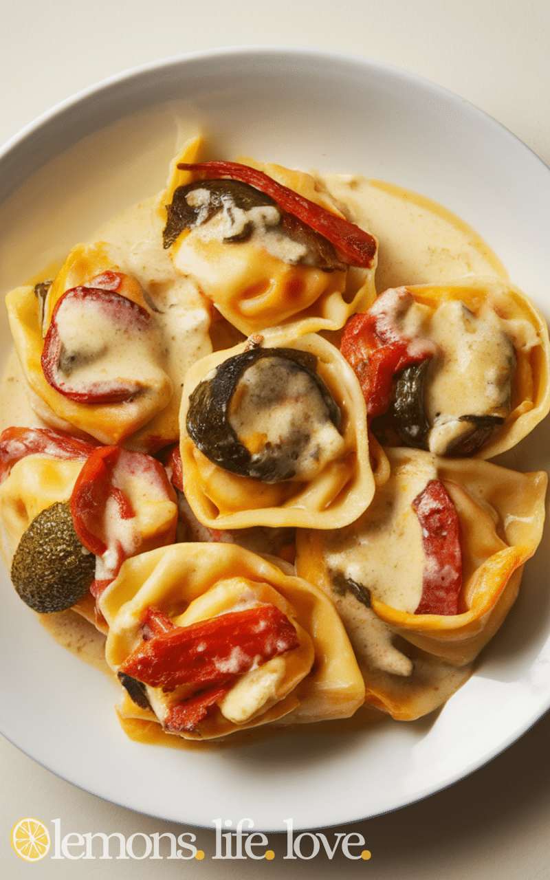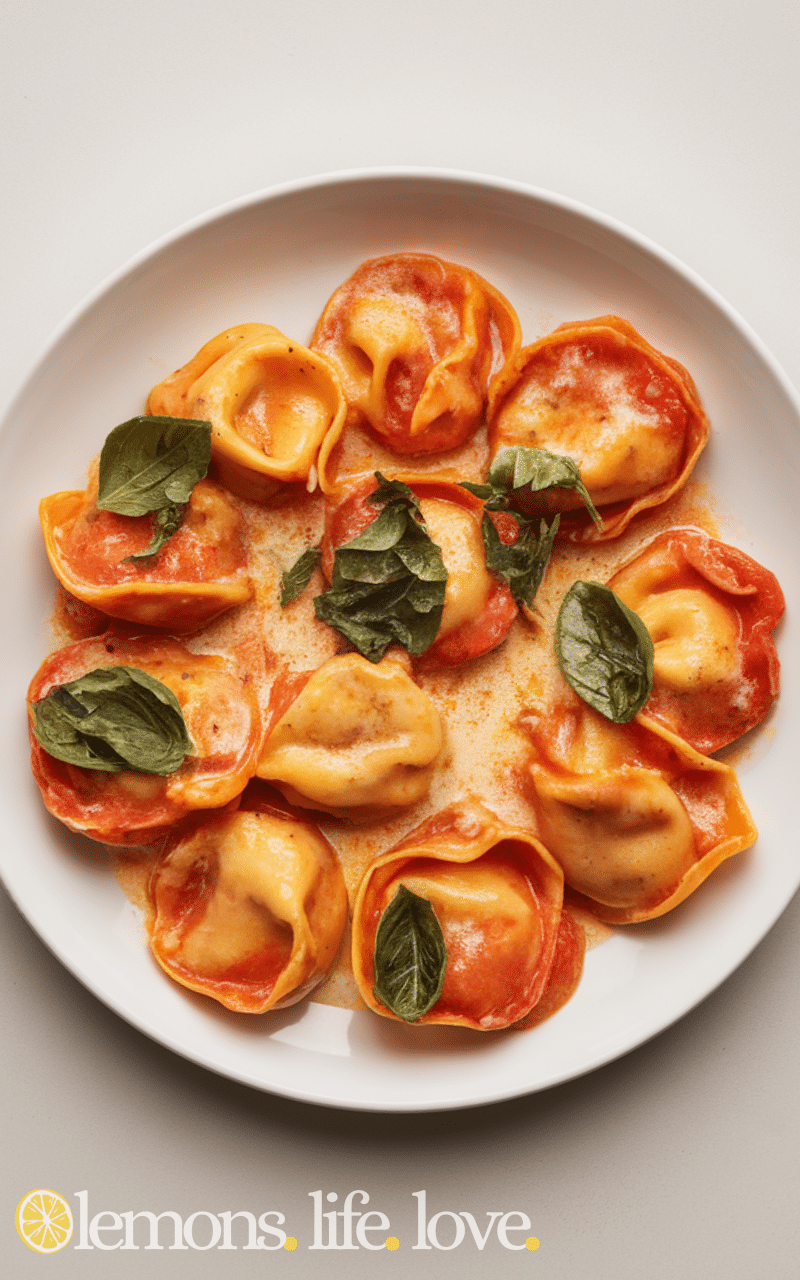 - Toss in cooked cheese tortellini and coat well with the sauce.
