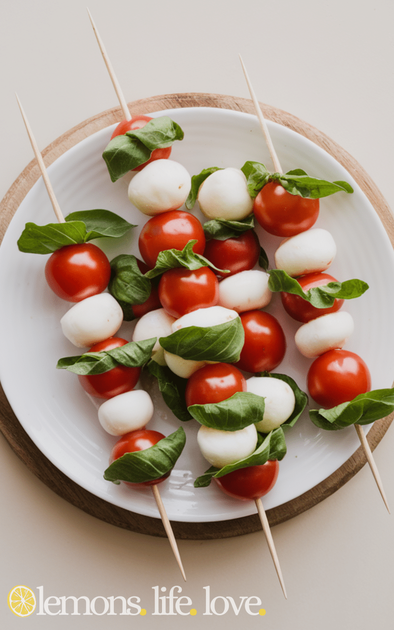 Caprese Skewers are fresh and colorful. Cherry tomatoes, mozzarella, and basil on small skewers make it fun to eat. They are healthy, easy to pack, and visually appealing.