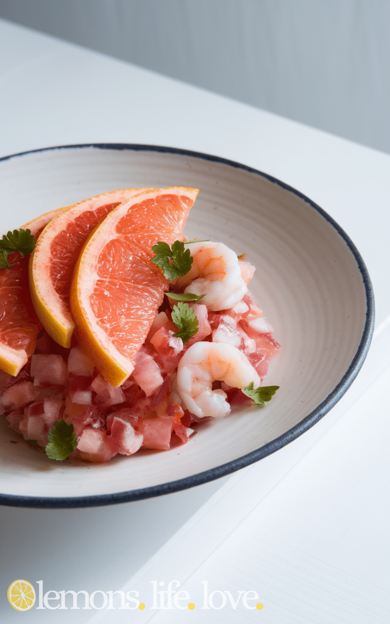 Grapefruit and shrimp ceviche is fresh light and zesty because the grapefruit juice “cooks” the shrimp and adds citrus flavor which makes this grapefruit recipe an easy appetizer for summer parties because it’s refreshing and full of bright flavors and textures that everyone will love.