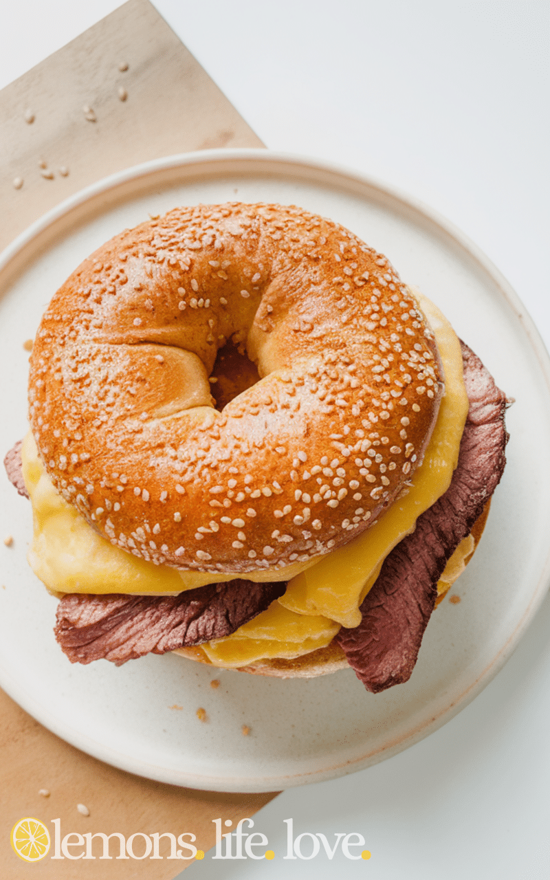 Hearty and indulgent with steak, sautéed onions, and provolone cheese on a toasted bagel. Savory, cheesy, and filling.