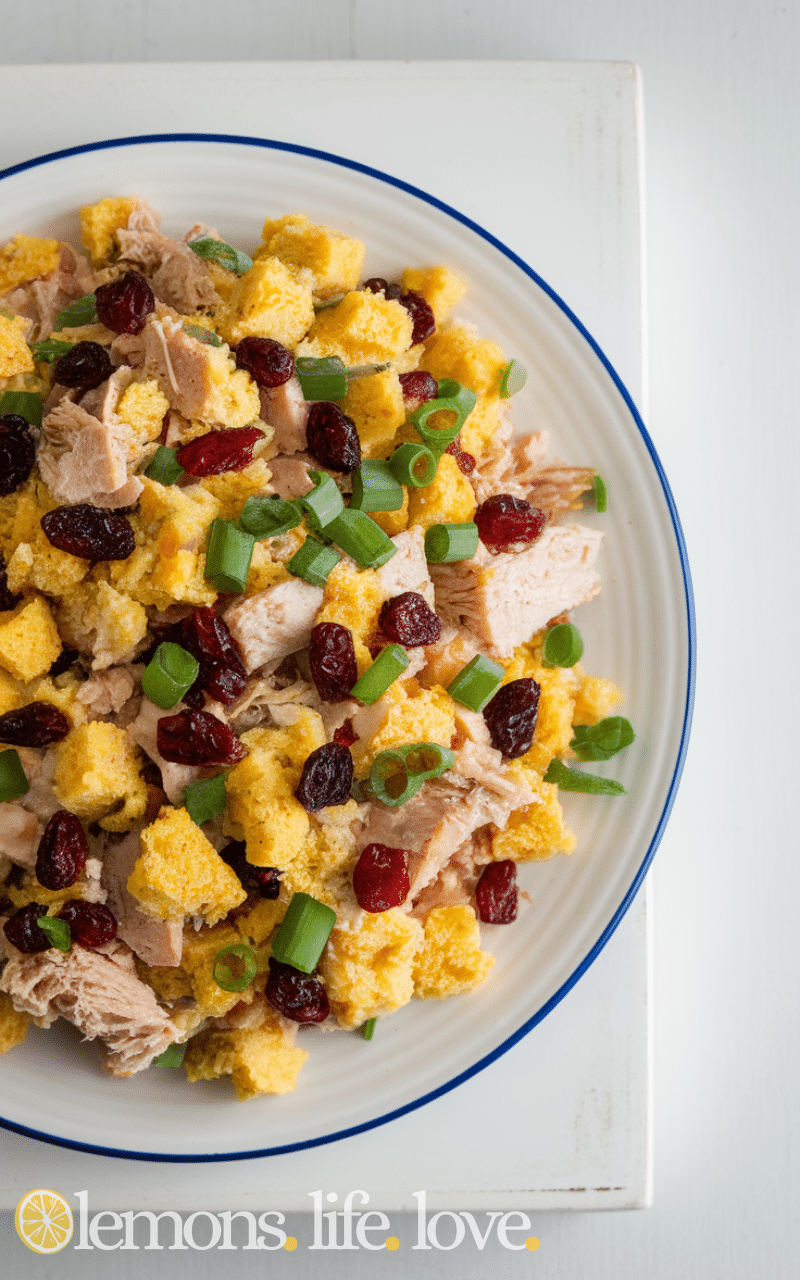 This Turkey and Cranberry Cornbread Salad is a festive twist and it combines leftover turkey with sweet cranberries and soft cornbread for a comforting and hearty dish. It is great for using up holiday leftovers and this cornbread salad tastes sweet and savory at the same time and it is easy to make and feels like Thanksgiving in a bowl.