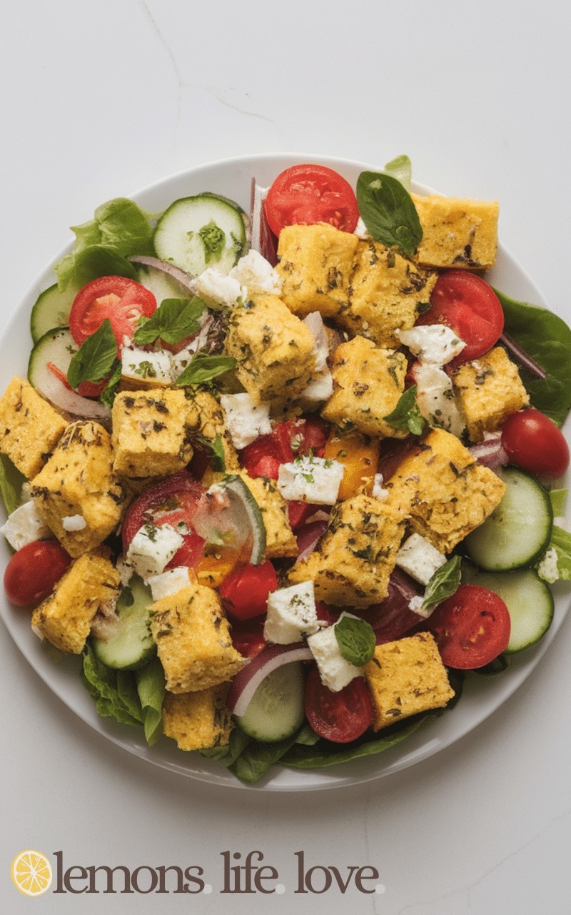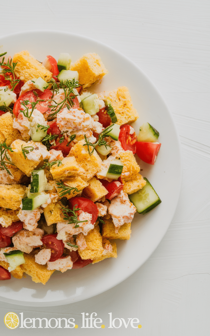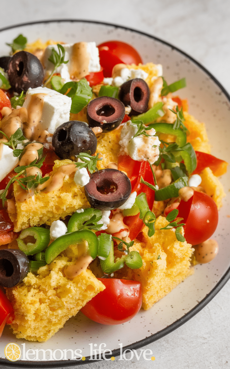 The Greek-Style Cornbread Salad is fresh and light and it mixes cornbread with cucumbers and tomatoes and olives and feta cheese and it is a unique twist on the classic cornbread salad that you will love. It has a Mediterranean taste that pairs perfectly with olive oil and lemon dressing and it is easy to make and great for a quick healthy meal or side dish.