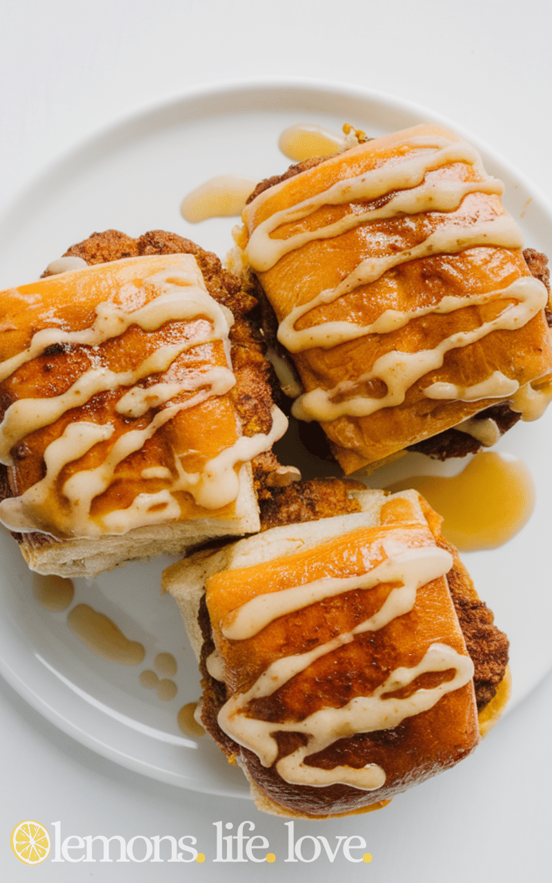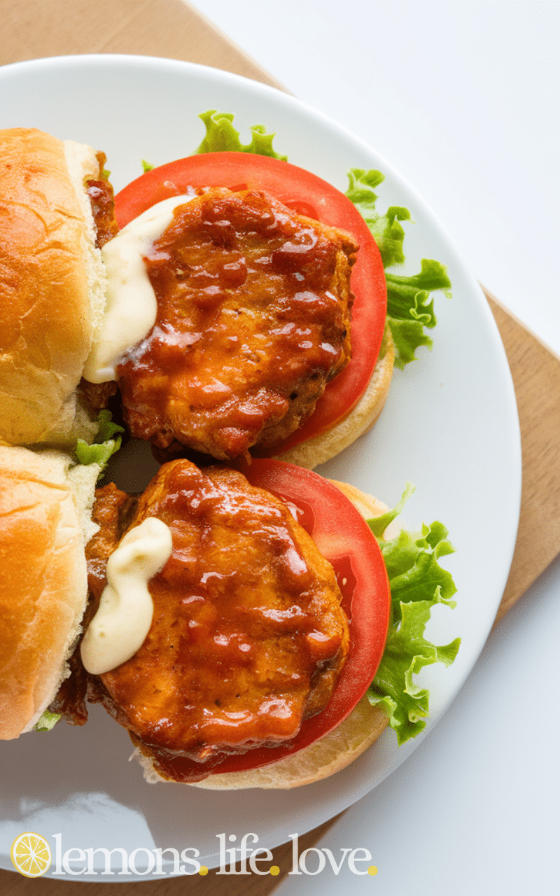 - Drizzle ranch dressing over the chicken and cover with bun tops