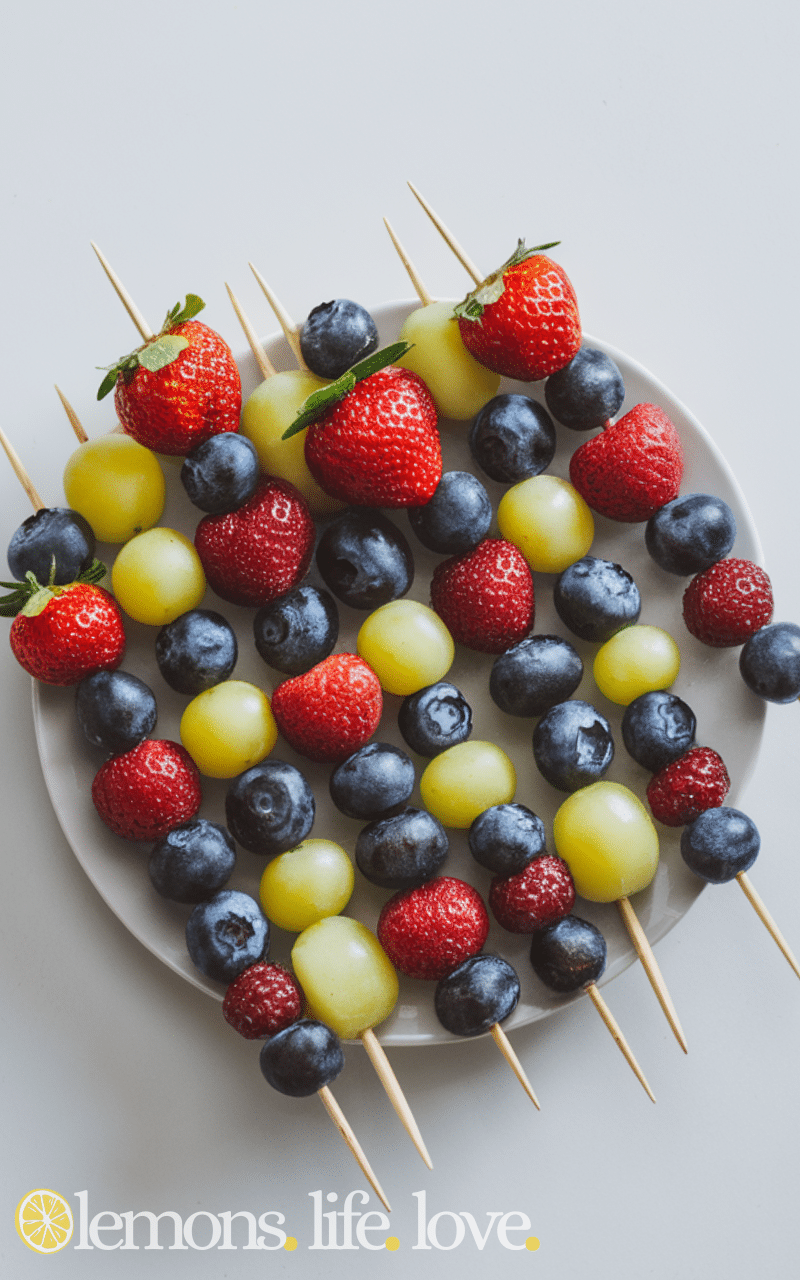Fruit skewers are a fresh and colorful choice for your dessert charcuterie board and they combine juicy fruits like melon berries and pineapple and they add brightness and crunch and they are healthy and fun to eat and everyone can grab a skewer and enjoy a sweet treat and they balance the rich desserts on your dessert charcuterie board and they look so inviting and delicious.