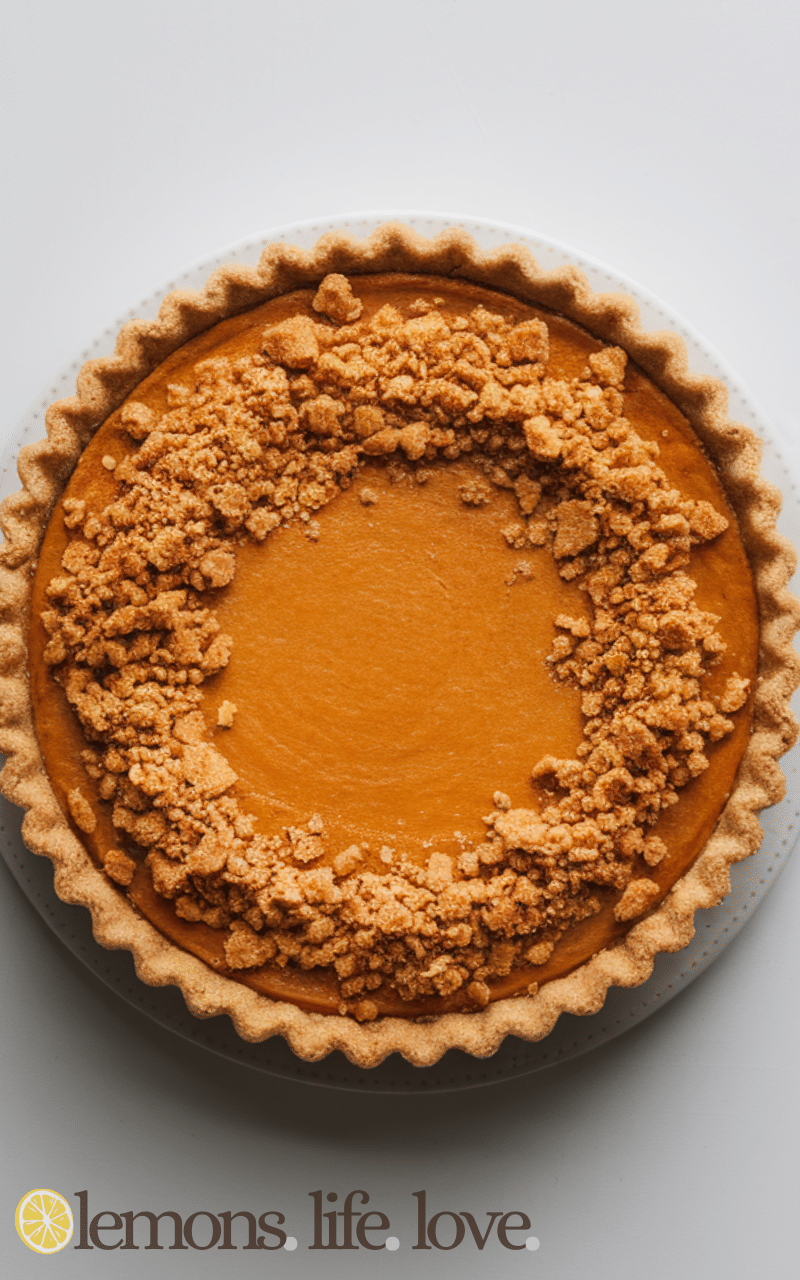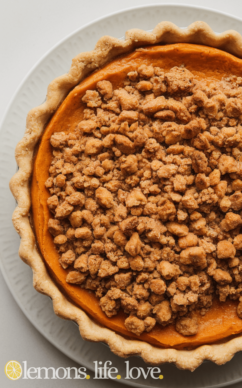 This sweet potato pie has a buttery brown sugar crumble topping that adds sweetness and crunch which makes every bite more delightful and cozy.