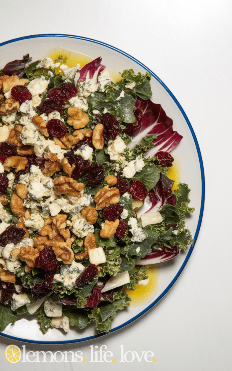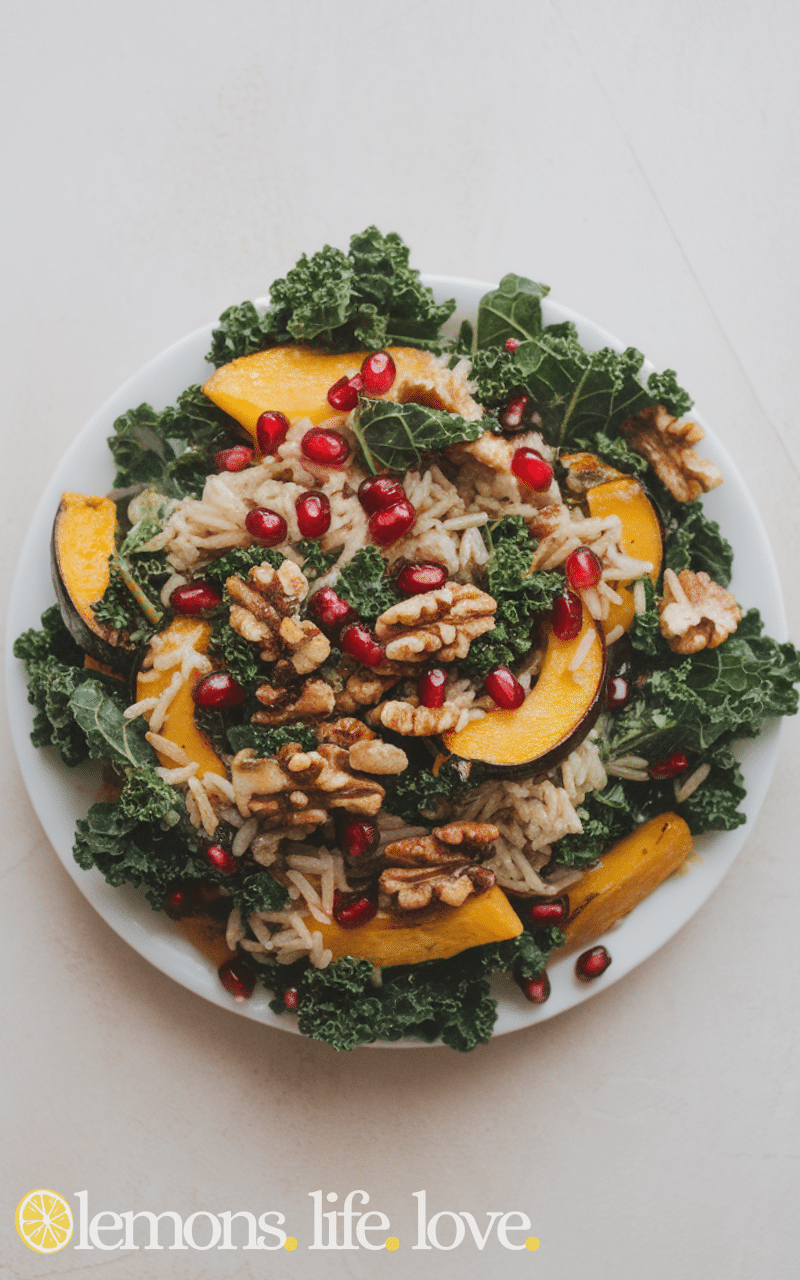 This winter salad is bold and colorful because kale and radicchio combine with pomegranate and roasted squash and Parmesan so it’s a showstopper for any winter meal. It’s crunchy and hearty yet bright and tangy so it perfectly balances freshness and warmth.