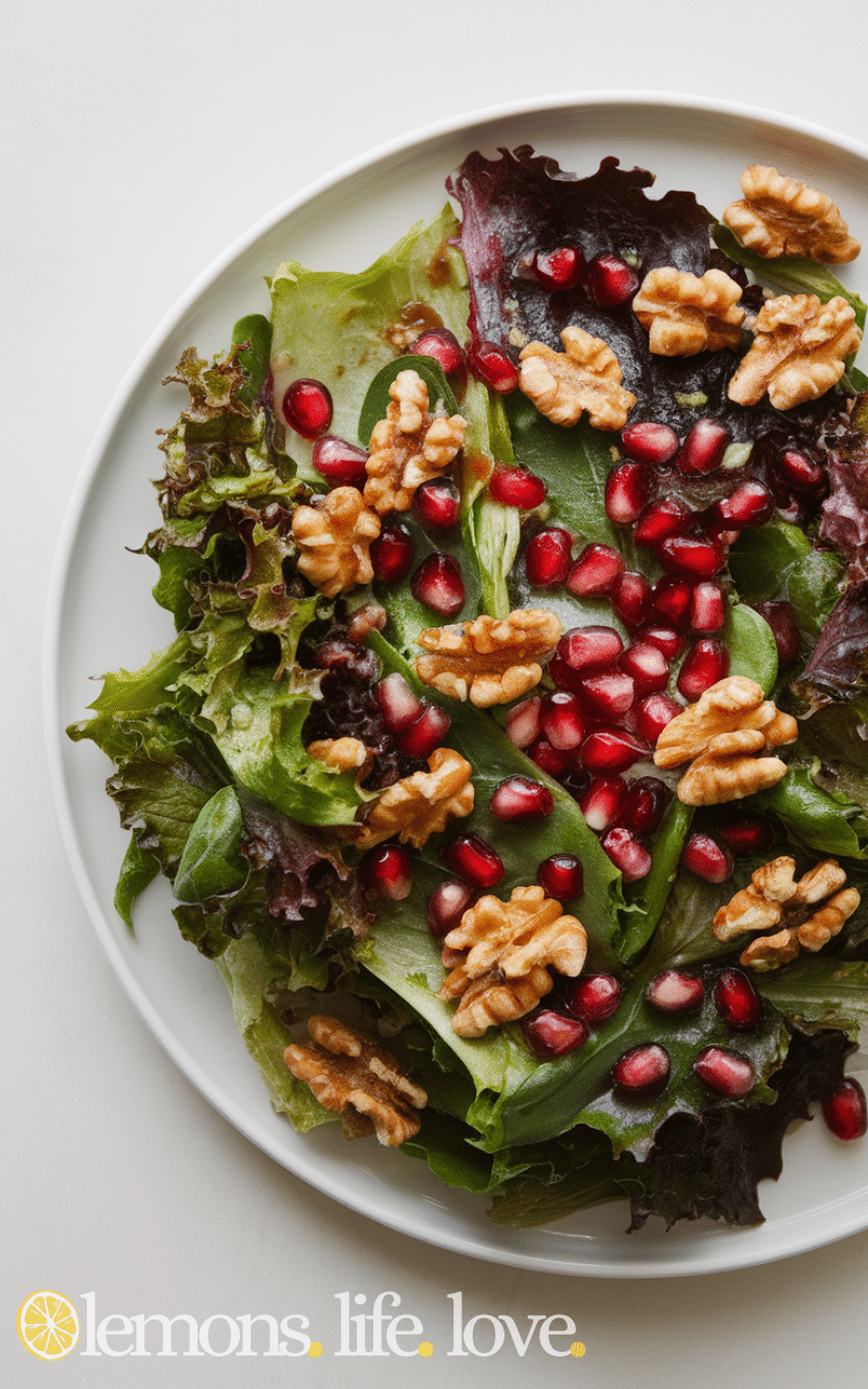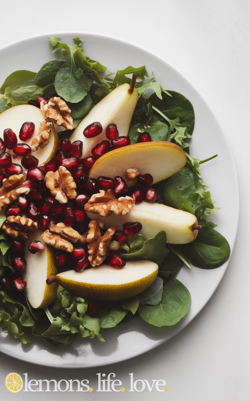 This winter salad tastes fresh and crisp because ripe pears mix with pomegranate seeds and crunchy walnuts so every bite has sweetness and crunch. The mild feta adds creaminess and the vinaigrette gives a zesty touch that makes this winter salad light yet satisfying for any winter meal. Ingredients