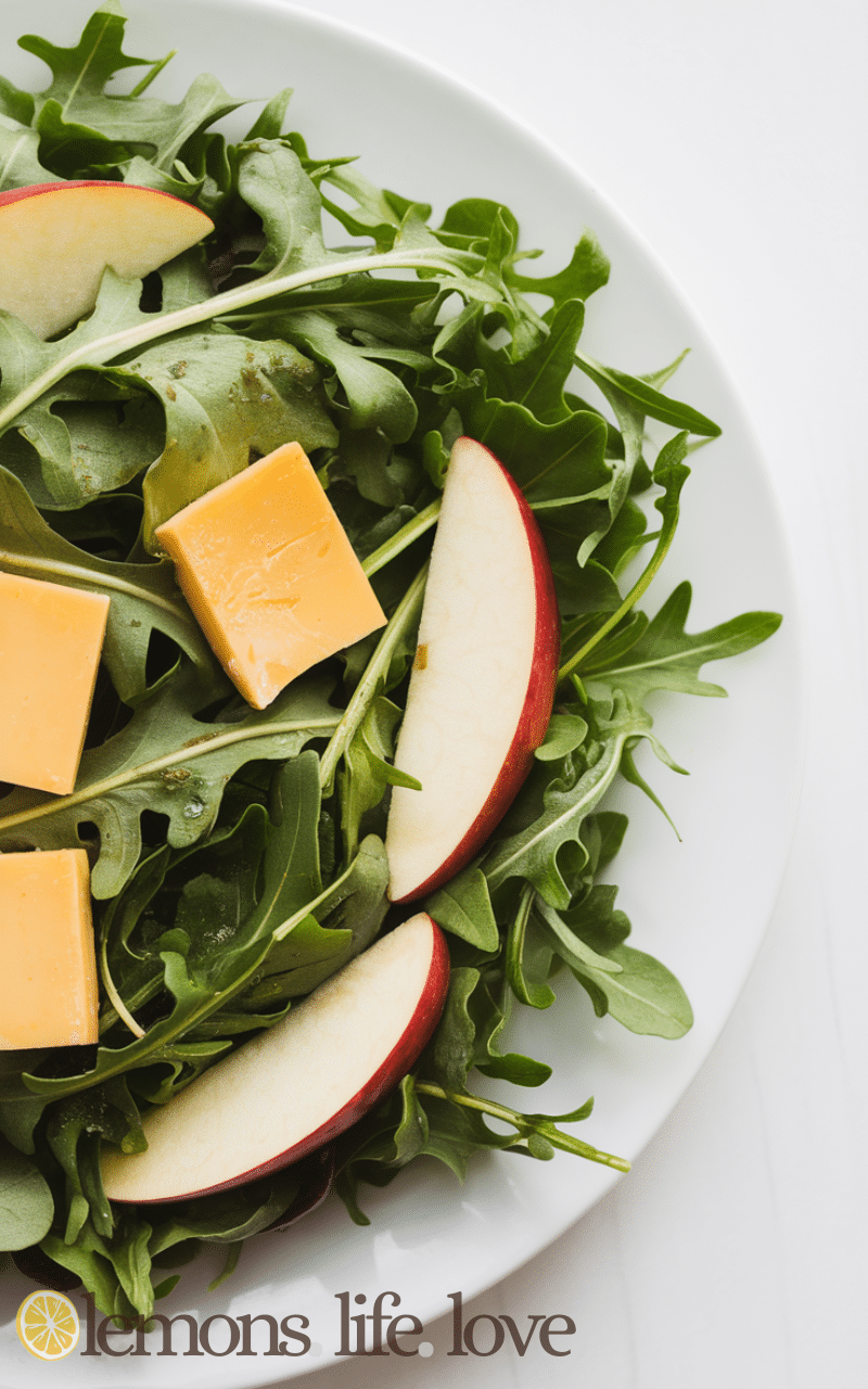 - Arrange arugula, apples, Gouda, and walnuts in a bowl.